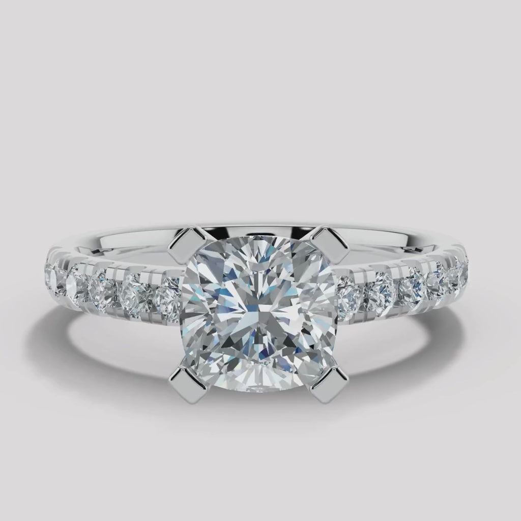 This exquisite engagement ring is a testament to refined elegance, showcasing a cushion cut diamond with scallop set diamond shoulders that is meticulously cut to radiate an enchanting sparkle. Choose from the timeless elegance of white gold, the warm tones of yellow and rose gold, or the enduring strength of platinum to perfectly complement your unique love story.
