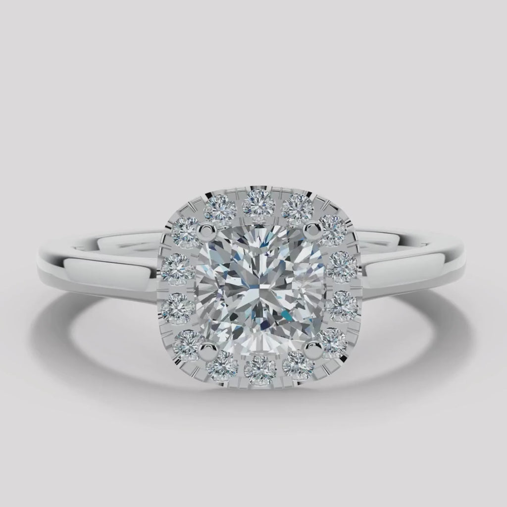 This exquisite halo engagement ring is a testament to refined elegance, showcasing a cushion cut centre diamond with halo shape meticulously cut to radiate an enchanting sparkle. Choose from the timeless elegance of white gold, the warm tones of yellow and rose gold, or the enduring strength of platinum to perfectly complement your unique love story.