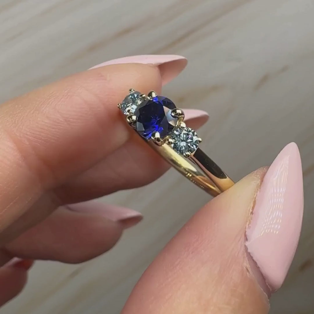 A captivating 1.5-carat round-cut blue sapphire sits at the heart of this stunning trilogy ring, its deep, velvety hue exuding sophistication and charm. Flanked by two round-cut blue diamonds, the design achieves a perfect balance of color and brilliance, creating an eye-catching yet elegant look.