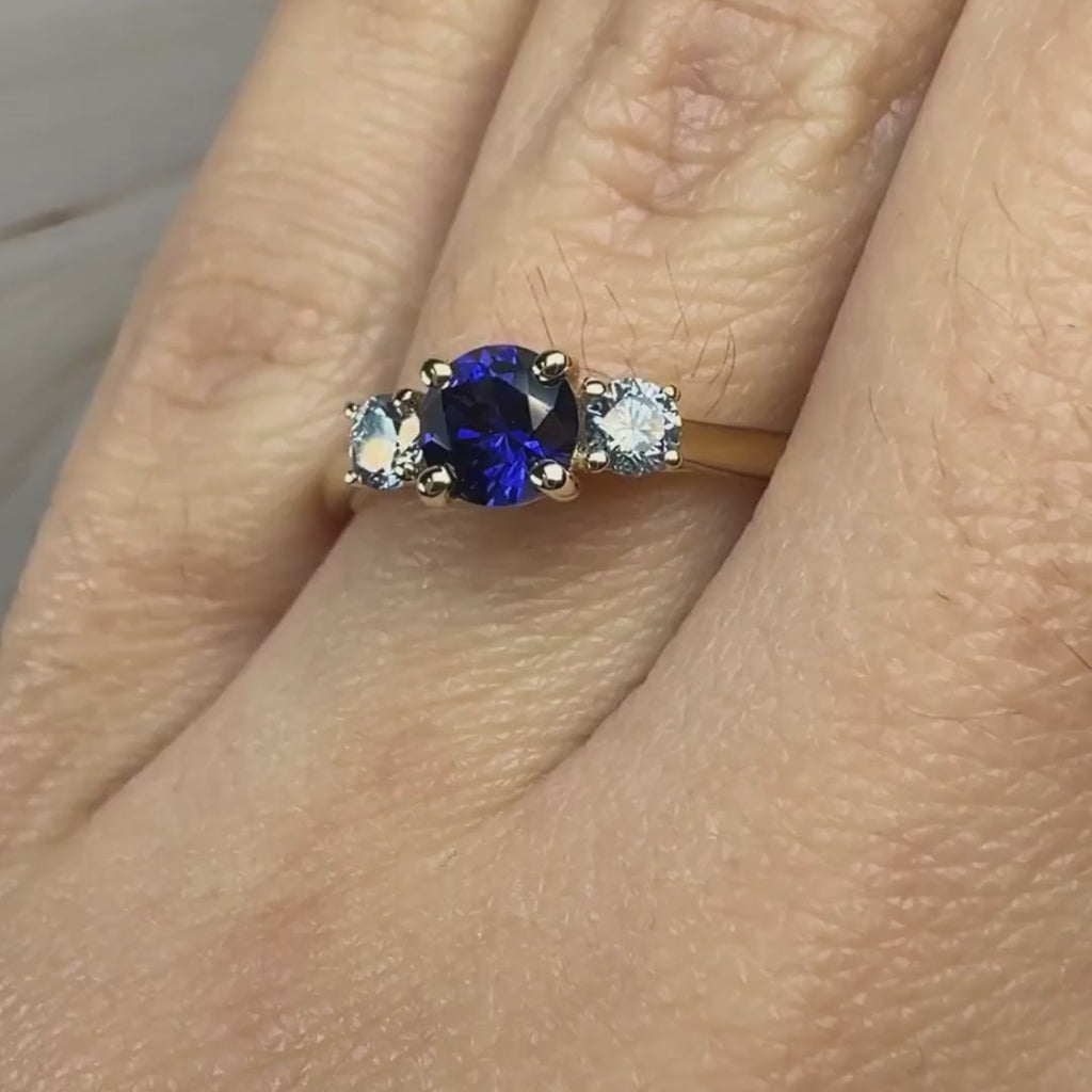 Side Stones: Round-cut blue diamonds, enhancing brilliance and contrast.