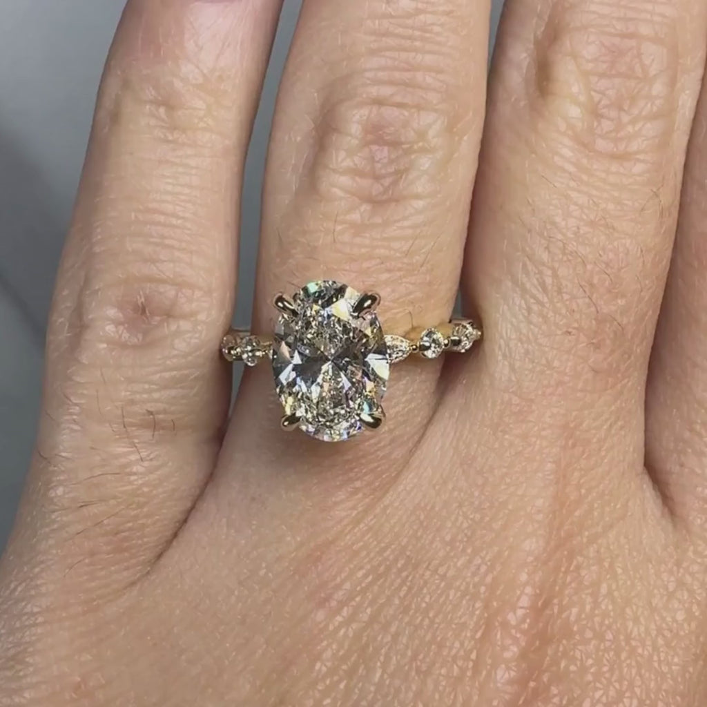 This stunning 5-carat oval diamond ring is a masterpiece of elegance and intricate design. The elongated oval-cut center stone showcases breathtaking brilliance and timeless sophistication, serving as the dazzling focal point of this extraordinary piece.