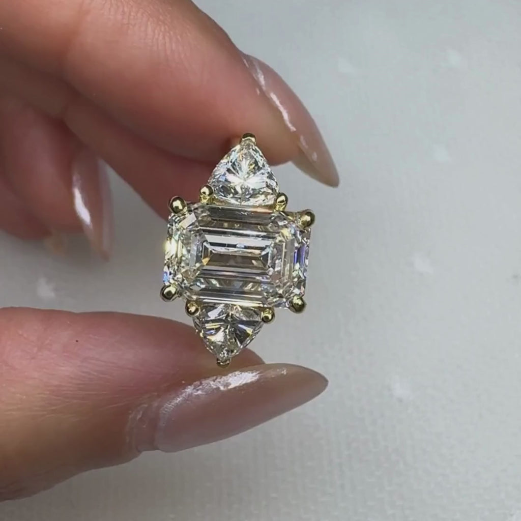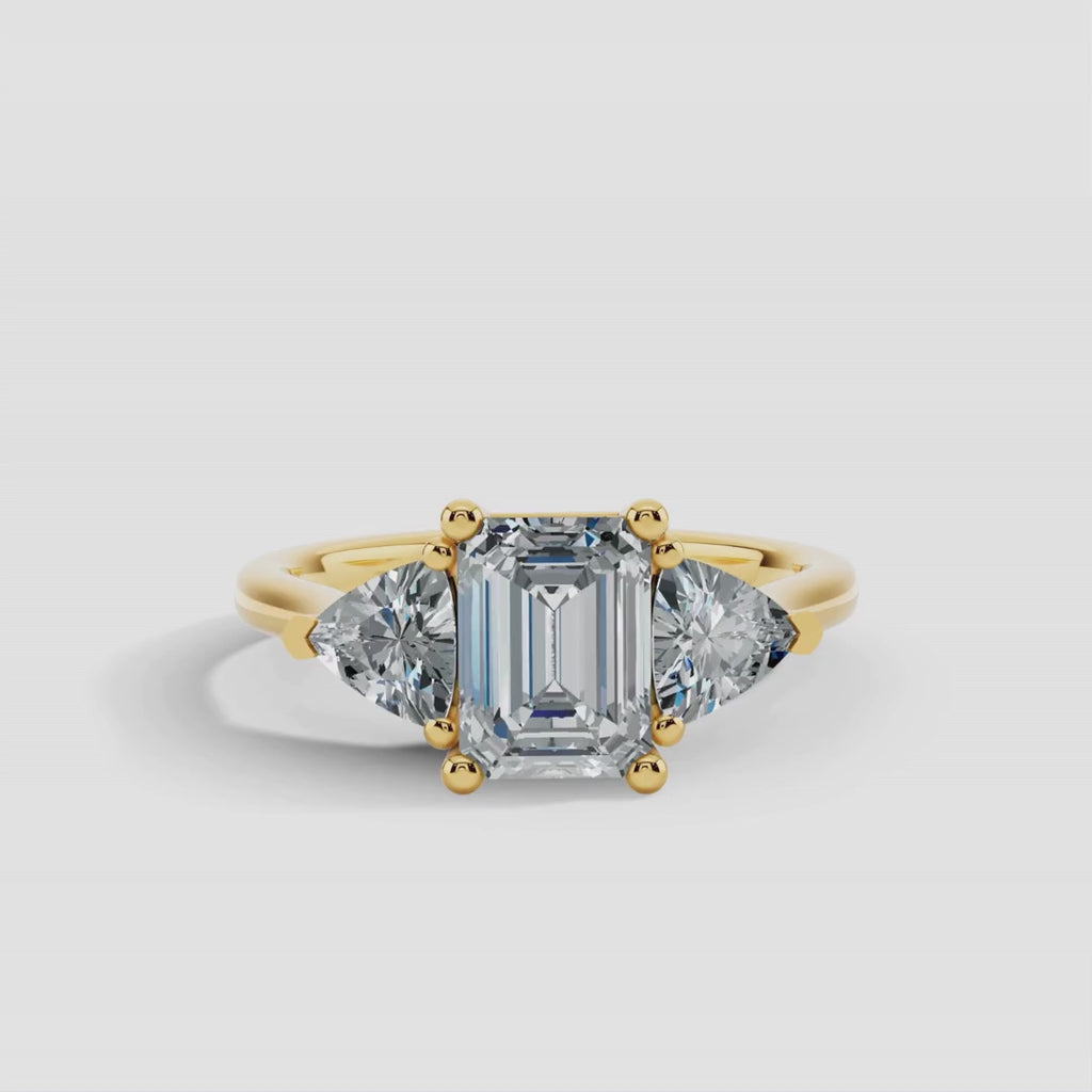 This timeless Three Stone Trilogy Engagement Ring showcases a 2.5 carat emerald-cut center diamond, known for its clean lines and understated brilliance. On either side, expertly matched trillion-cut diamonds add a modern geometric touch, perfectly complementing the centerpiece.