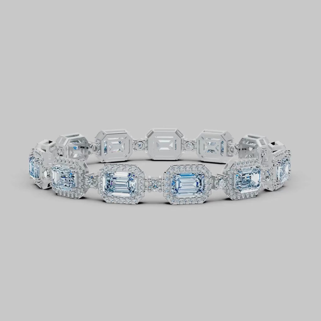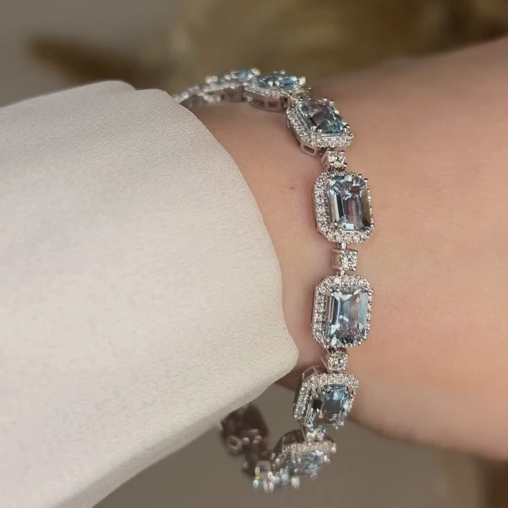 This magnificent 11-carat bracelet is a masterpiece of elegance and sophistication, featuring an exquisite alternating arrangement of emerald-cut aquamarines and round brilliant-cut diamonds. Each aquamarine, with its vivid blue hue, is encircled by a shimmering halo of smaller diamonds, amplifying its brilliance and allure. The alternating round diamonds provide a perfect balance, adding sparkle and depth to the design. Set in sleek platinum or white gold, this bracelet exudes timeless luxury and refined craftsmanship.