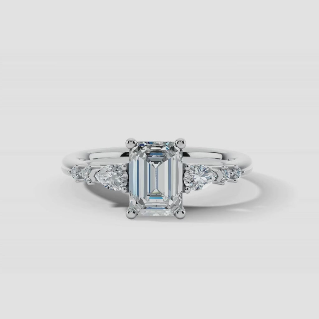 Cradling the center stone are two pear-shaped diamonds, like delicate drops of light that soften the silhouette with effortless charm. Just beyond, two round brilliant diamonds on each side amplify the sparkle, adding layers of dimension and light.