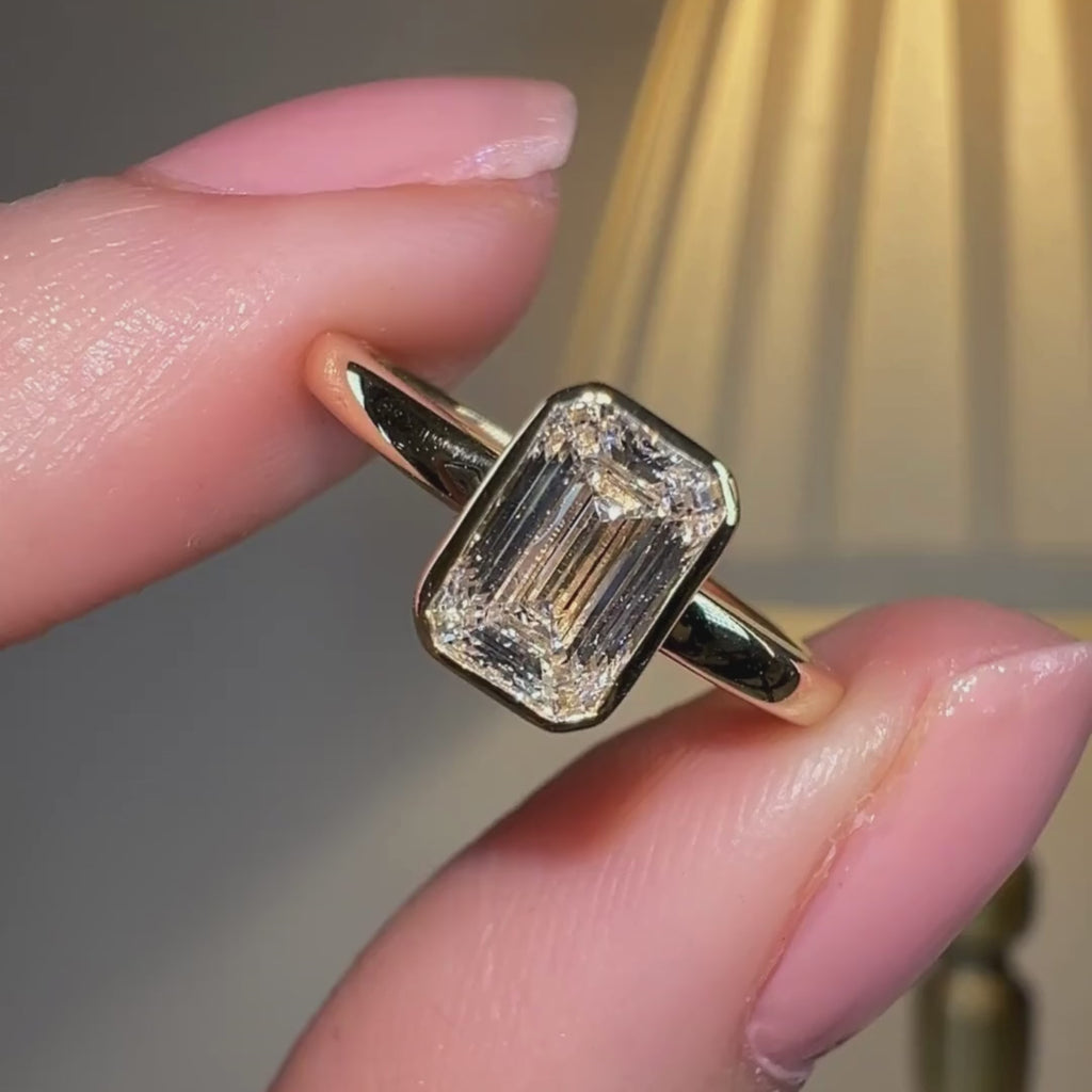 This stunning ring showcases a striking 5-carat emerald-cut diamond as its centerpiece, exuding timeless sophistication and unmatched brilliance. The diamond is gracefully embraced by an 18k yellow gold bezel setting, which enhances its clean lines and geometric elegance while offering superior protection. The warm tones of the yellow gold band beautifully complement the diamond’s clarity, creating a harmonious and luxurious design.