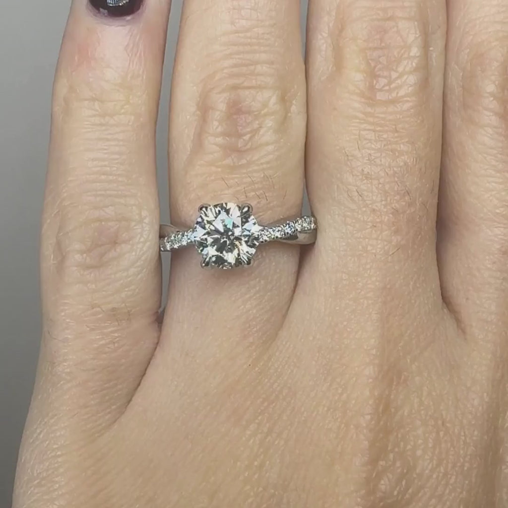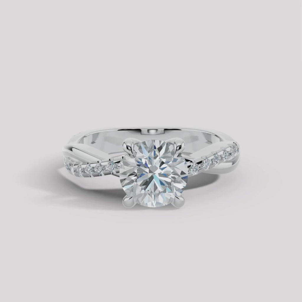 This stunning ring features a 2-carat round-cut diamond as its centerpiece, radiating timeless brilliance. The diamond-adorned shoulders gracefully flow into a twisted-style platinum band, creating a modern yet elegant design.