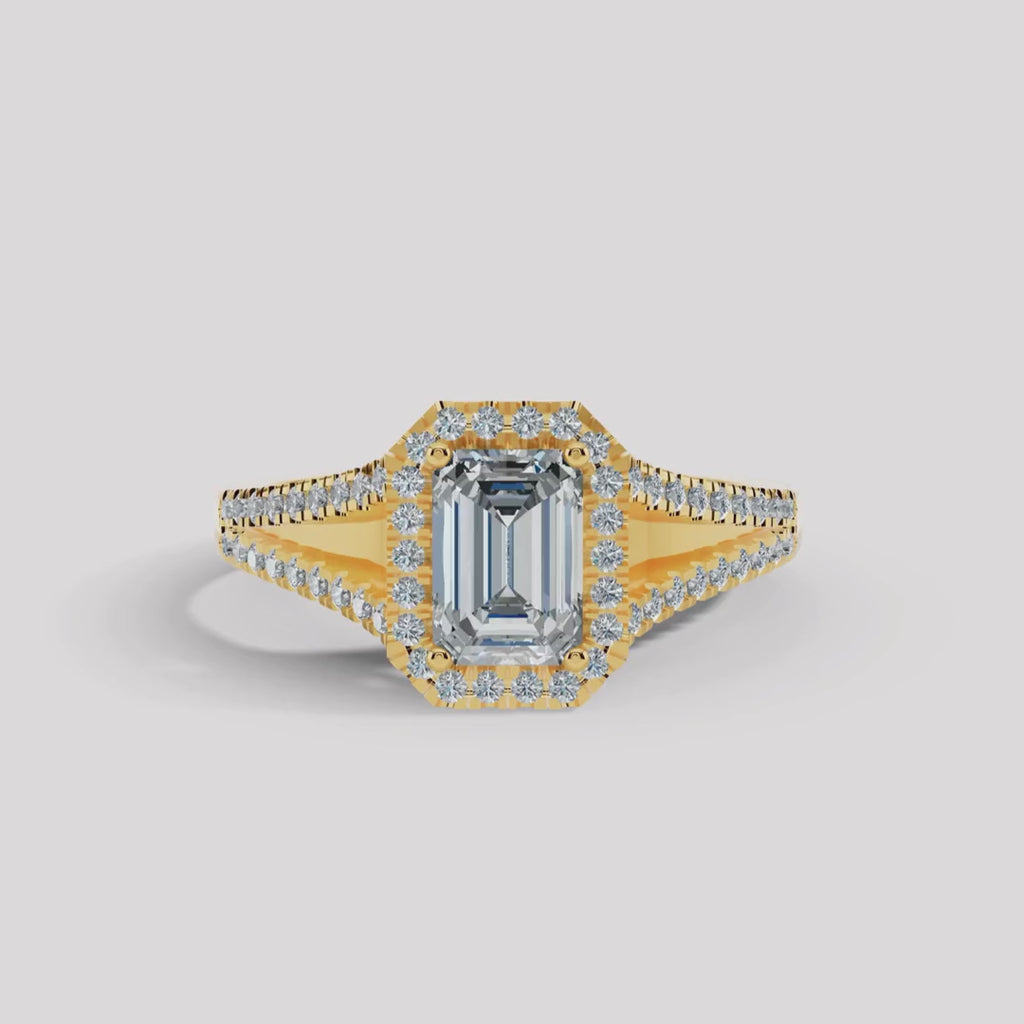 his emerald-cut beauty is a timeless symbol of elegance and grandeur. Featuring a breathtaking 2-carat emerald-cut center stone, its clean lines and captivating brilliance make a striking statement.