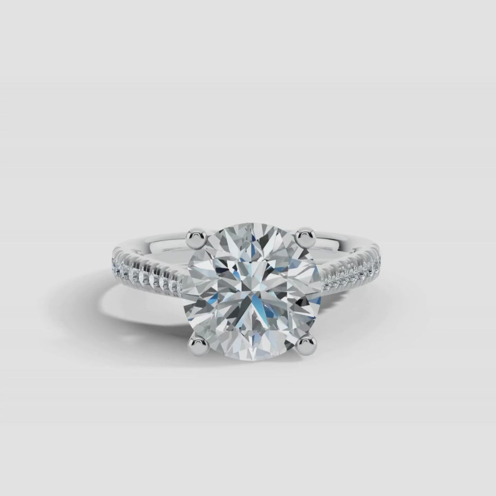 This exquisite engagement ring is a testament to refined elegance, showcasing a round brilliant cut diamond with micro set diamond shoulders that is meticulously cut to radiate an enchanting sparkle. Choose from the timeless elegance of white gold, the warm tones of yellow and rose gold, or the enduring strength of platinum to perfectly complement your unique love story.