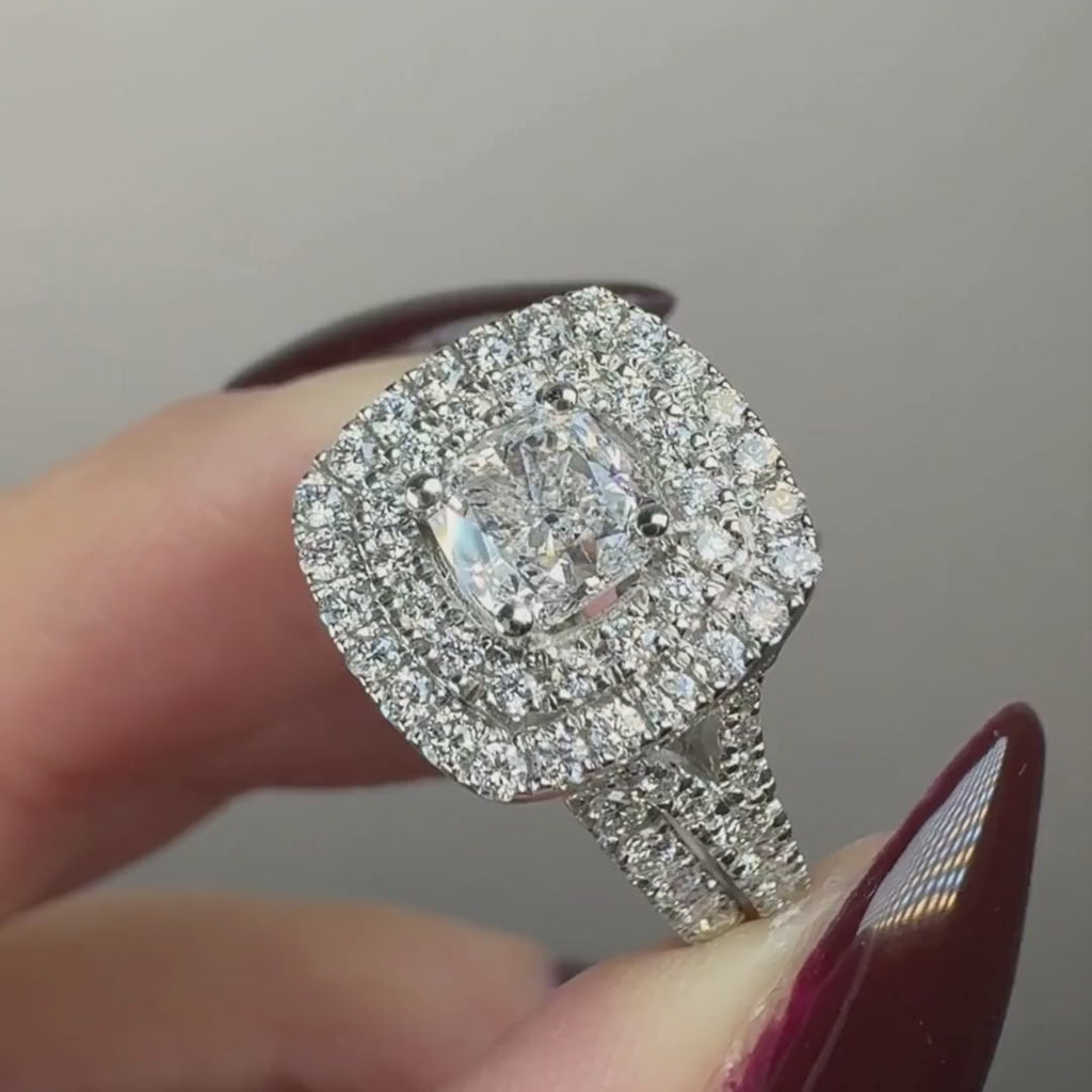 This dazzling set features a 2-carat cushion-cut diamond at its center, surrounded by a double halo of round diamonds that enhance its brilliance and presence. The diamond-adorned shoulders add extra sparkle, perfectly complementing the luxurious design.