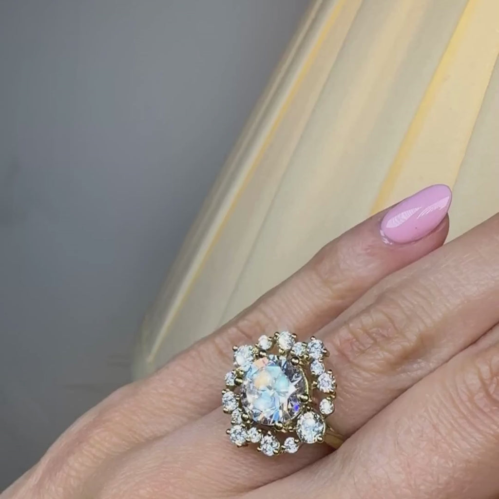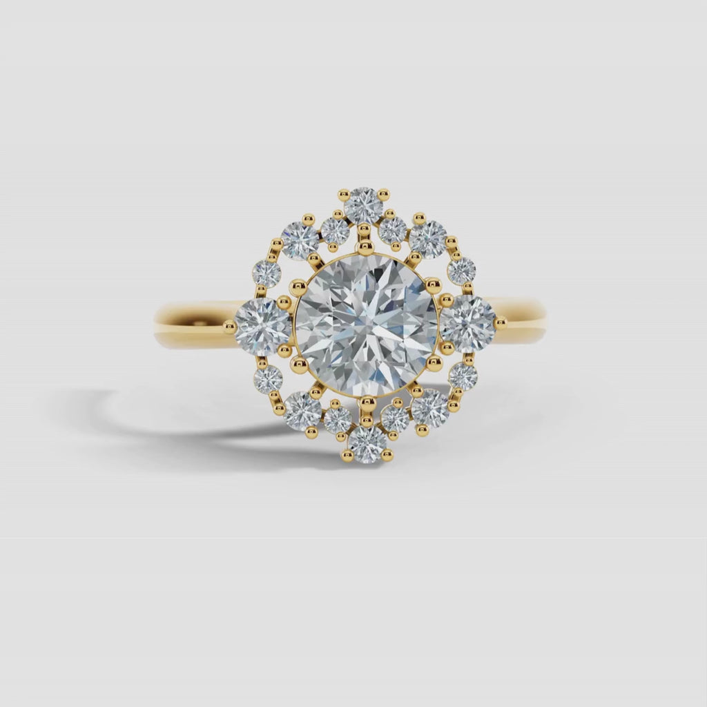 Halo Design: A halo of round-cut diamonds in different sizes, artfully arranged to add depth, sparkle, and visual intrigue.