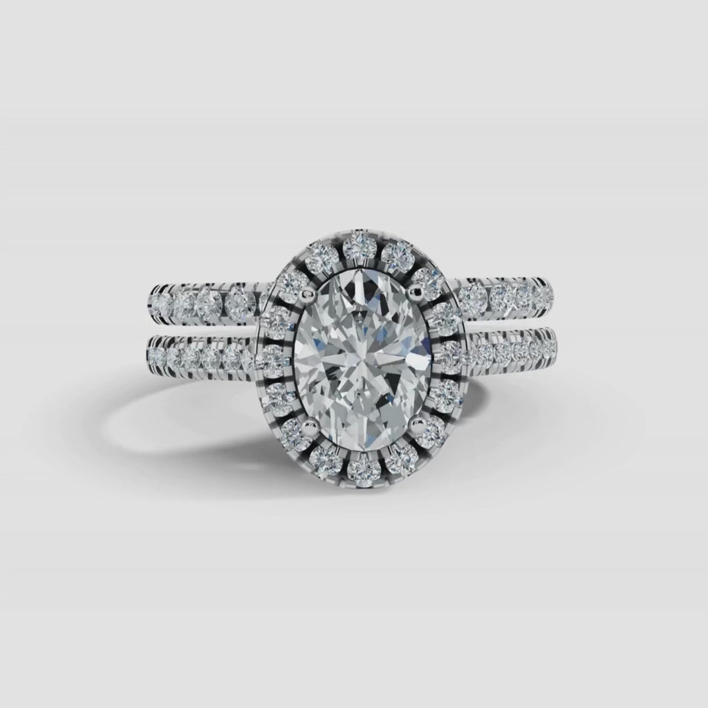 This exquisite bridal set engagement ring is a testament to refined elegance, showcasing a brilliant central oval cut diamond that is meticulously cut to radiate an enchanting sparkle. The ring is adorned with a halo equally radiant micro set round cut diamonds, each set in a delicate balance that exemplifies harmony. Comes with matching half eternity ring that compliments ring. Made with timeless elegance of platinum to perfectly complement your unique love story.