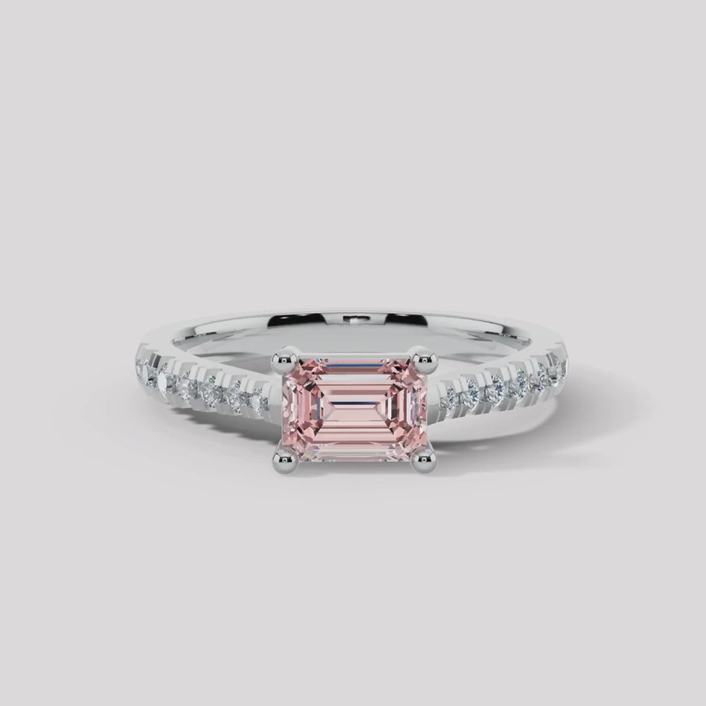 Center Stone: 1.01-carat emerald-cut pink lab-grown diamond and 0.30 ct side diamond, exuding romance and unique brilliance.